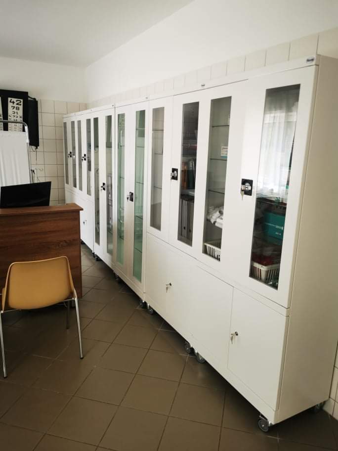A támogatásnak köszönhetően az orvosi rendelő teljes bútorzata megújult. Gazdagabbak lettünk vizsgálóasztallal, kartotékszekrényekkel, vizsgálólámpával, lepedőtartó állvánnyal, különböző méretű gyógyszerszekrényekkel, kétlépcsős fellépő zsámollyal, gázrugós forgószékekkel, görgős infúziós állvánnyal, fiókos eszköztartókkal, vérvételi székkel, eszköztartó állványokkal, beépített bútorral és3 íróasztallal.