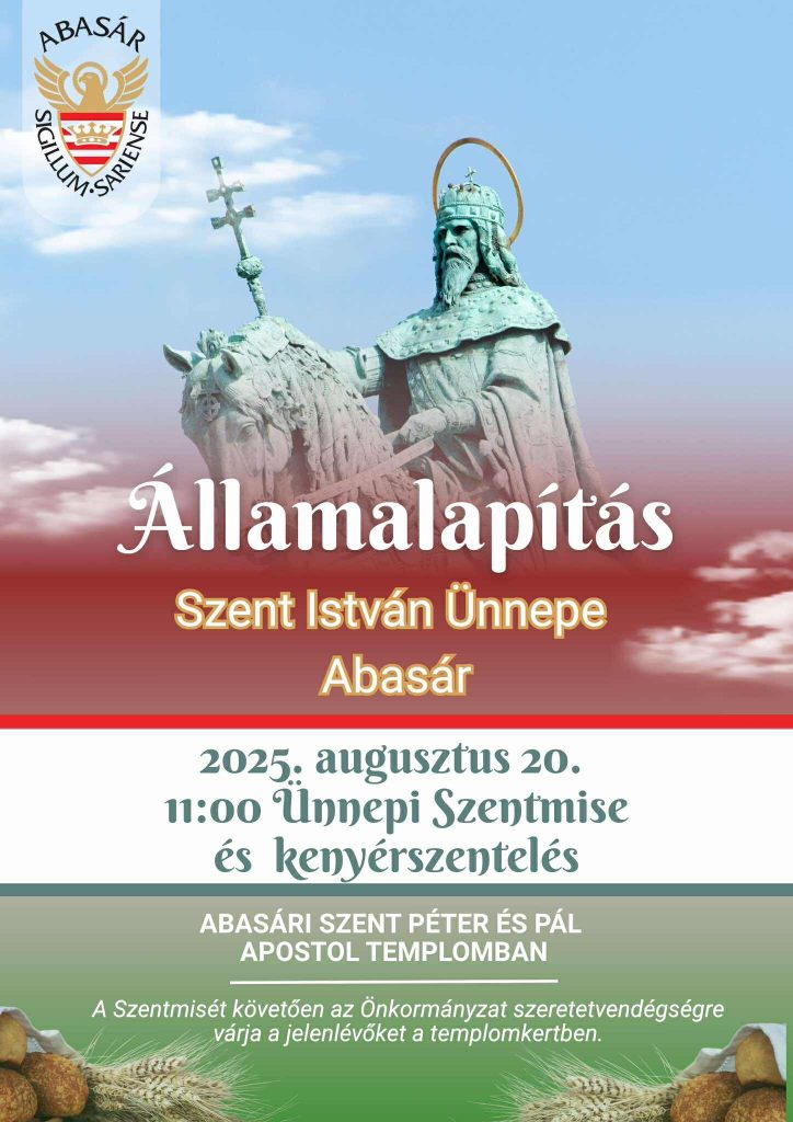 Tisztelettel meghívjuk a Lakosságot 2025. augusztus 20. napján 11 órára az Abasári Szent Péter és Szent Pál Apostolok Templomába, Ünnepi Szentmisére és Kenyérszentelésre.